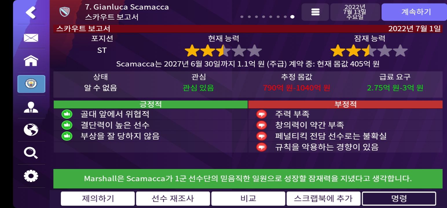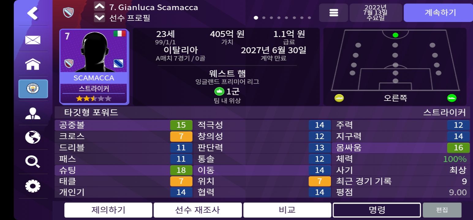 어쩌다 보니 이번 시즌에 이적한 선수만 거의 추천해드리는 것 같...) 개인적인 말씀을 드리자면 저는 타겟터 선수를 굉장히 선호하는 편입니다. 이번에 소개해드리는 스카마카 선수는 타겟터로서 좋은 능력치를 보유하고 있어 이번에 소개해드리는 시간을 가져보았습니다. 역시나 첫 시즌에는 가격이 상당하고 영입이 어려울 테지만 상황을 지켜보다가 영입을 해도 괜찮을 나이인지라 추천 드립니다. 역시나 히든이 조금 아쉽기는 하지만 그럼에도 타겟터를 찾고 계신다면 추천 드립니다.