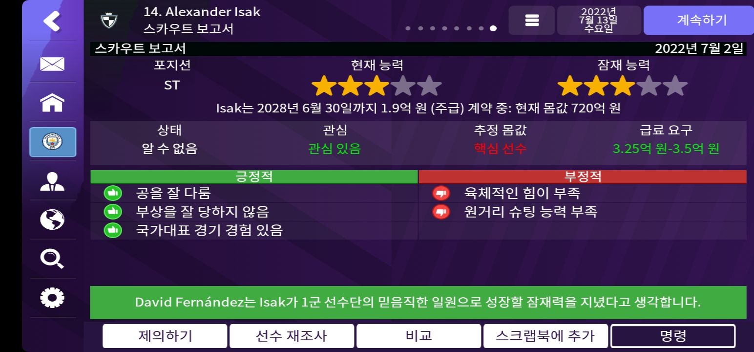 아래 선수들을 바로 영입하기엔 가격이 너무 높아서 망설이신다면 우선은 한 시즌은 영입 명단에 넣으신 후에 상황을 잘 주시하시다 이적제의를 하시는게 훨씬 좋습니다. 여기서 말하는 상황이란 추후에 자세하게 설명을 드리겠습니다만, FMM 2023 특성상 뜬금없는 이적이 이루어지는게 많기 때문에 예를 들면 제가 플레이 하던 게임에선 아스날이 램즈데일 선수가 있음에도 불구하고 또 다른 주전 키퍼를 영입해 램즈데일 선수가 경기에 잘 나오지 못해 불만이 있는 것을 확인한 후 영입을 진행했습니다. 그러니, 램즈데일 본인도 이적을 수락했고 아스날 또한 그렇게 까지 높은 이적료를 부르지 않고 이적을 수락했습니다. 이와 같이 상황을 잘 주시하시며 영입을 하시는게 FMM 2023을 즐기는 방법 중 하나가 아닐까 하는 생각이 듭니다.