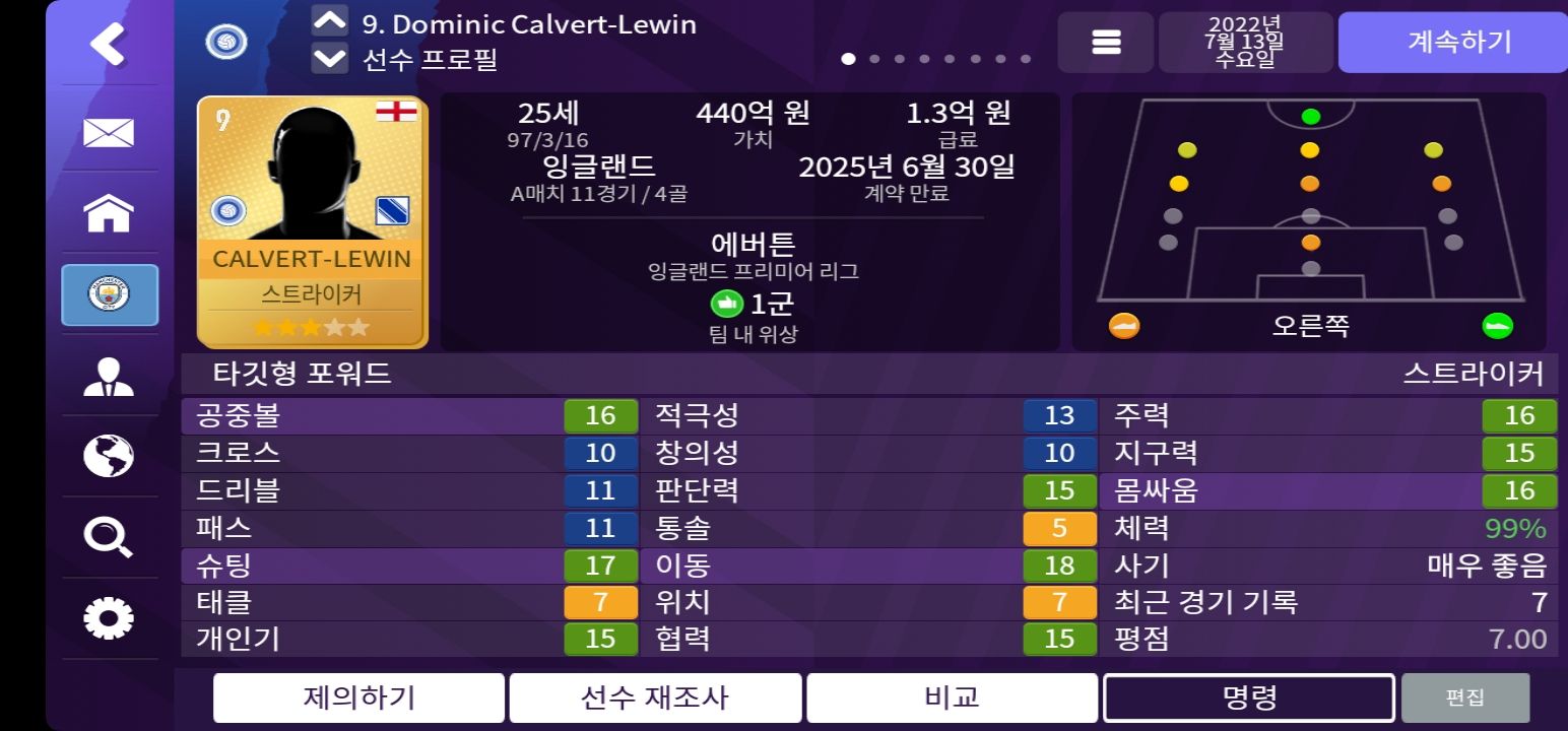 - 다음으로 추천드릴 선수는 에버튼의 공격수 도미닉 칼버트 르윈 선수입니다. 앞서 소개해드린 케인 선수와 비슷한 느낌이지만 속도와 나이면으로 보면 분명히 이 선수를 더 선호하시는 감독님들이 있을 것 같습니다. 그도 그럴게 25이라는 그렇게 많지 않은 나이이고 스트라이커로서 좋은 능력치를 보유하고 있기 때문에 돈이 여유가 있다면 첫 시즌에 영입을 하시는게 좋을 것 같습니다. 보유하고 히든은 아쉽게도 세트피스 키커로서 담당은 하지 못합니다. 그럼에도 불구하고 영입을 할 수 있다면 하시는 걸 추천 드립니다. 능력치와 보고서로만 보면 좋은 선수임이 틀림없기 때문입니다. (