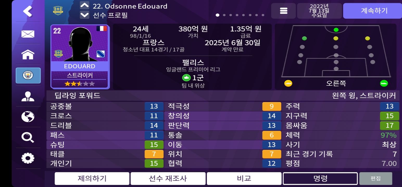- 이번에 소개해드릴 선수는 오드손 에두아르 선수입니다. 크리스탈 팰리스 소속으로서 이번에도 타겟터 느낌이 강하게 나는 선수입니다. 보유하고 있는 히든으로는 큰 경기를 즐김과 페널티 키커를 가지고 있습니다. 아직 성장할 수 있는 나이여서 조금만 더 성장시킨 다면 스쿼드를 탄탄하게 만들어 줄 선수임은 분명합니다. (다만, 가격이 너무 높은게 흠이긴 합니다.)
