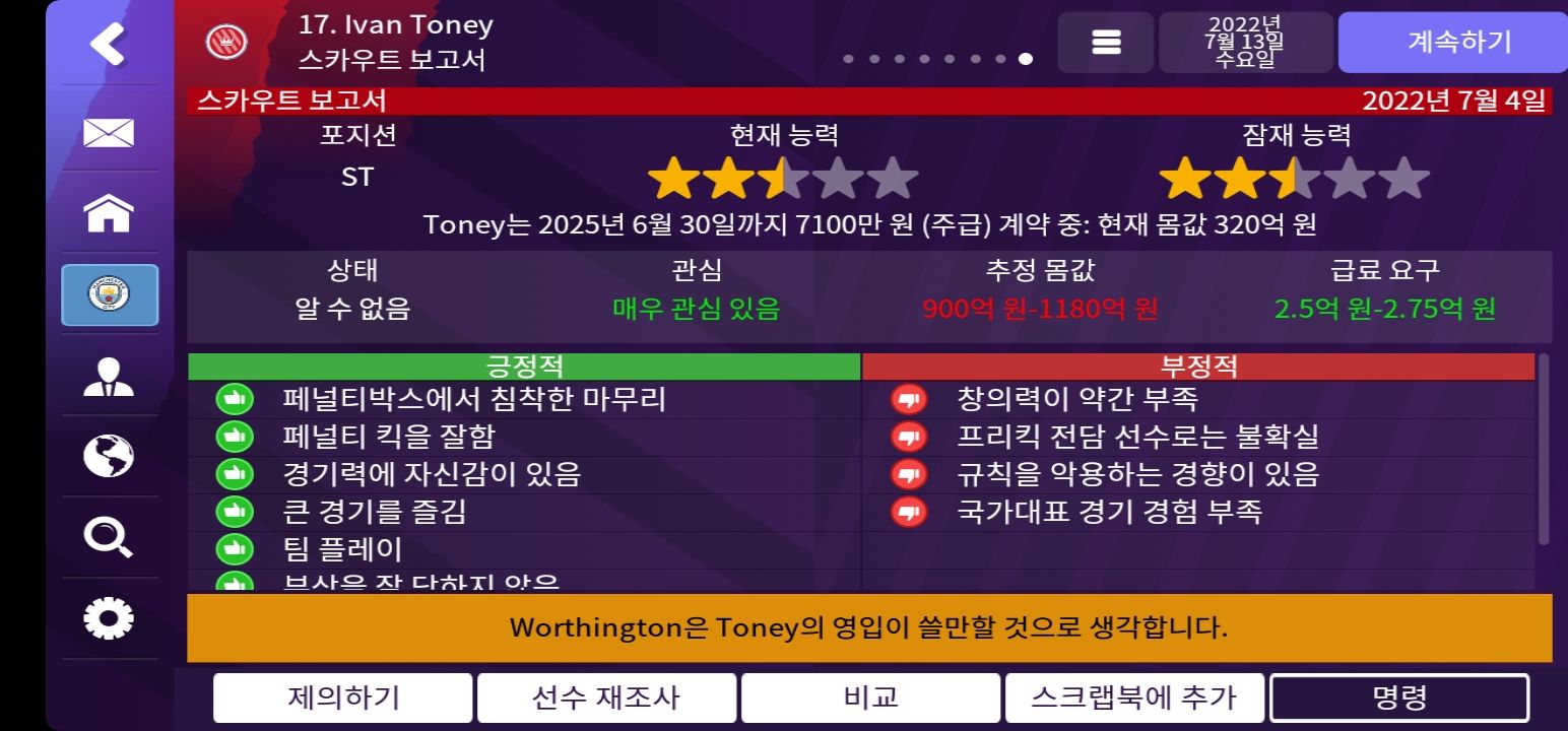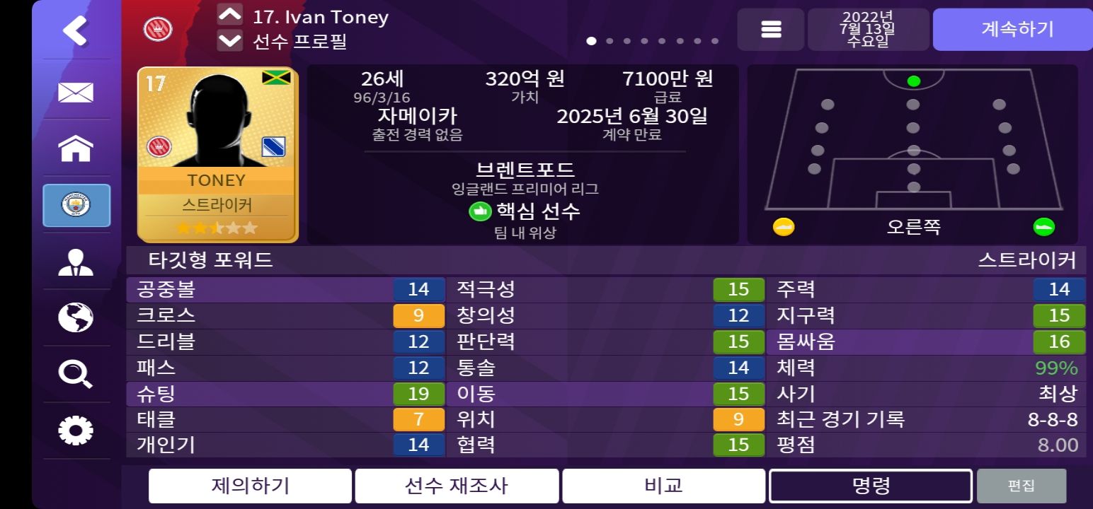 - 이번에 추천드릴 선수는 현재 EPL의 강한 돌풍을 일으키고 있는 브렌트포드 소속인 이반 토니 선수입니다. 이중국적이라 잉글랜드에서 자메이카로 변경을 했습니다. 잉글랜드 국적을 보유하고 있어서 그런지 꽤 높은 이적료가 책정되어 있는데 능력치를 보신다면 100% 이해는 못하지만 어느정도 수긍이 가는 정도로 좋은 능력치를 보유하고 있습니다. 속도를 조금만 더 키우면 포쳐 역할도 준수하게 소화가 가능할 것이라 보입니다. 히든 또한 경기력에 자신감이 있음과 큰 경기를 즐김이 있어 좋은 히든을 보유하고 있습니다. 다만, 더티플레이 성향이 있어 카드관리를 해주셔야 할 것 같습니다. 팀의 공격수에 무게감이 조금 떨어진다 싶으시면 영입을 해보시는 걸 추천 드립니다.