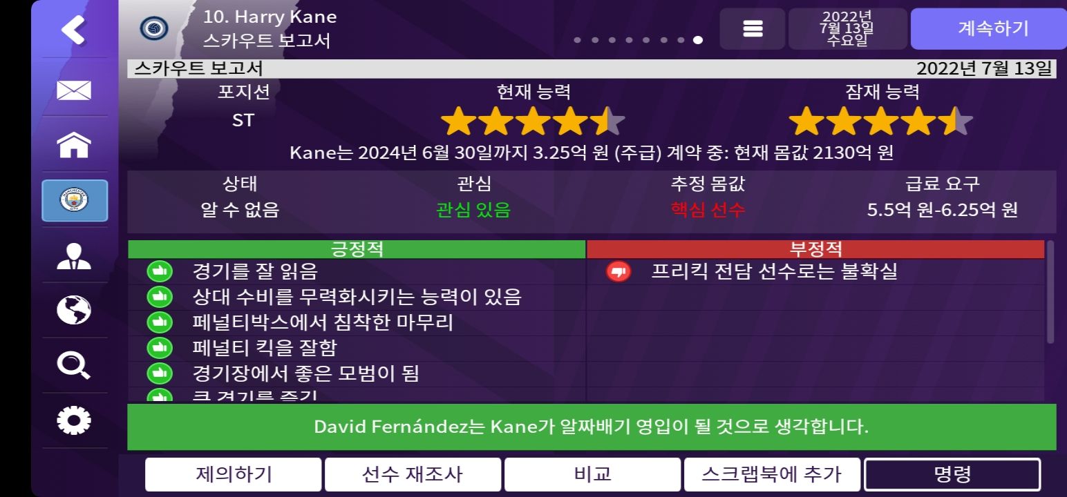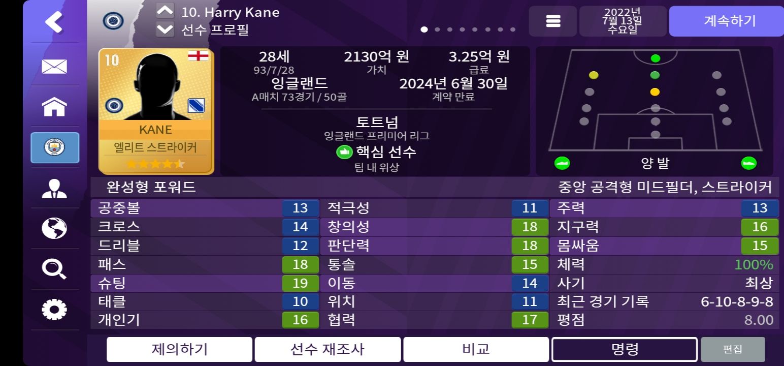 - 처음으로 소개해드릴 선수는 토트넘 그 자체인 해리 케인 선수입니다. 확실히 이 선수를 토트넘에서 빼오는 게 엄청 어려운 일이겠지만 비싼 가격을 지불할 만할 가치가 있는 선수임이 틀림 없습니다. 느린 발을 가지고 있긴 하지만 그 외의 능력치는 수준급이며 특히 슈팅 능력치는 현재 EPL 최고의 스트라이커임을 나타내는 수준이 아닌가 싶습니다. 히든 또한 수준급의 선수답게 경기장에서 좋은 모범이 됨과 큰 경기를 즐김, 페널티 키거등을 가지고 있습니다. 첫 시즌에 형성된 가격은 2130억으로 엄청난 몸값을 자랑하긴 하지만 한 두 시즌 상황을 지켜본 후 영입이 가능한 상황이 되어 영입을 한다면 좋은 선수가 될 것임은 틀림 없습니다.