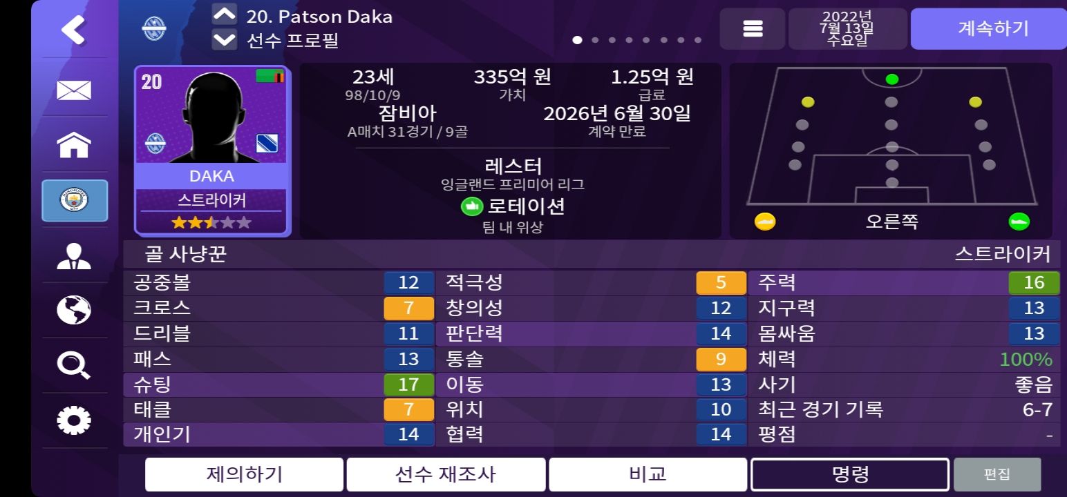 - 다음으로 추천드릴 선수는 레스터 시티 소속인 다카 선수입니다. 능력치로만 보면 좋은 주력과 슈팅 능력을 보유하고 있어 포쳐 스타일의 선수를 찾으신다면 추천드릴 선수입니다. 다른 능력치도 준수함을 보여주고 있고 훈련과 경기경험으로 잘 성장만 해준다면 좋은 선수가 될 것임이 분명해 추천 드립니다. 보유하고 있는 히든으로는 결단력이 높음이 있지만 세트피스 키커로선 불확실합니다.