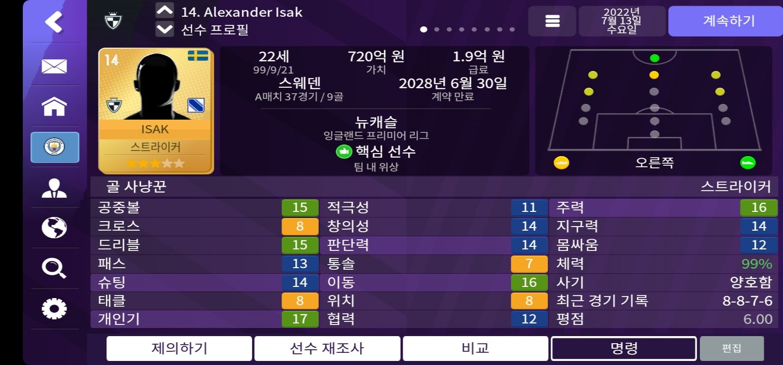 - 이번 시즌 뉴캐슬의 빅사이닝 선수 중 한 명으로 좋은 주력과 공중볼 능력을 보여주고 있으며 드리블, 패스 능력치도 준수하니 조금만 더 훈련을 통해 성장시킨다면 수준급의 선수가 될 것임은 분명합니다. 다만 이번 시즌에 이적이 된 선수인지라 첫 시즌에는 영입이 거의 불가능하다고 봅니다만 상황을 주시하시다 영입이 가능하다면 영입하시는게 좋을거라 생각됩니다. (다만 이번 시즌 FMM 2023에서 뉴캐슬의 성적이 예사롭지 않기 때문에 다소 높은 가격을 줘야 영입이 가능할 것 같습니다.) 좋은 능력치를 보여주고 있습니다만 히든 능력치가 다소 아쉽지만 좋은 선수임은 분명합니다.
