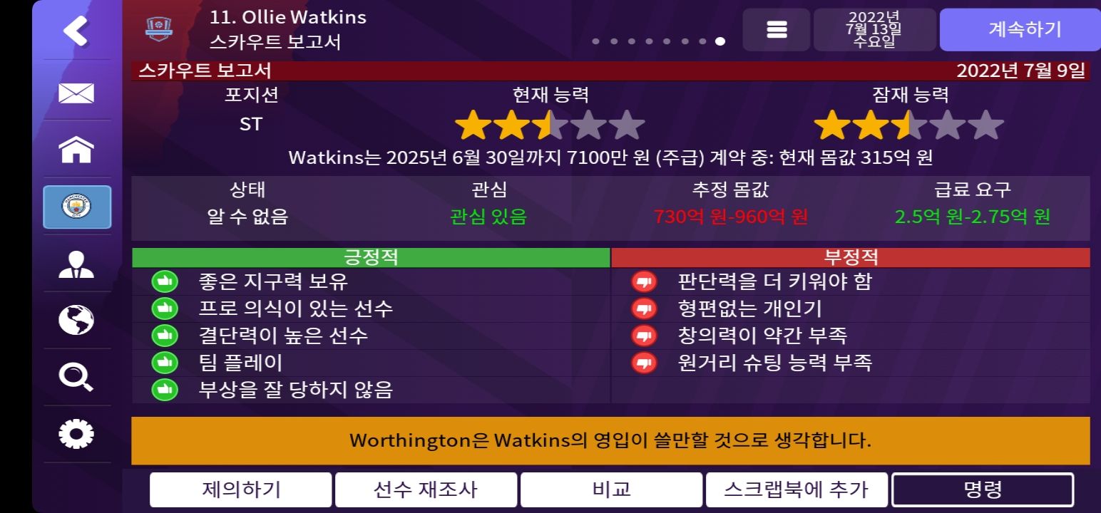 - 다음으로 추천 드릴 선수는 아스톤 빌라 소속인 올리 왓킨스 선수입니다. 잉글랜드 국적을 가지고 있어서 그런지 능력치와 나이에 비해 꽤 높은 이적료가 형성되어 있습니다. 다만, 히든으로 프로 의식이 있음과 결단력이 높음이 있어 잘만 키워주면 성장 할 가능성이 꽤 높습니다. (