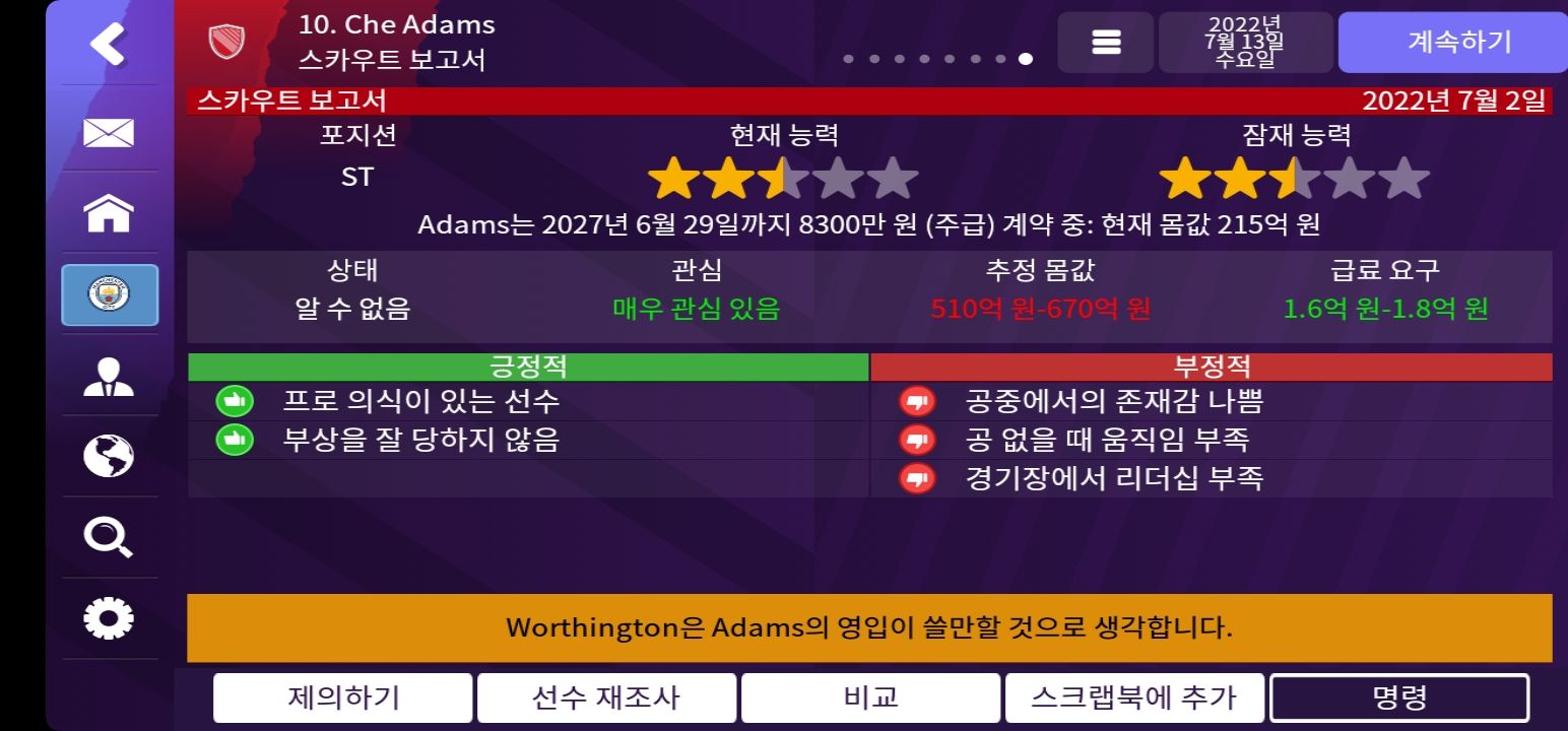 - 이 선수도 빅사이닝이라 하기엔 조금 갸웃거릴만할 선수이긴 하지만 다음에 올릴 '바겐헌터 선수 보고서'를 위한 선수인지라 이번 시리즈가 마지막 편인 겸 다음 시리즈를 홍보하기 위한 선수입니다. 채 아담스 선수는 포쳐로서 준수한 능력치를 보유하고 있으며 히든으로는 프로 의식이 있음이 있어 훈련을 통해 조금 성장할 가능성이 있어 보입니다. 좋은 가격에만 영입이 된다면 팀 스쿼드를 탄탄하게 만들 선수 임은 분명합니다.